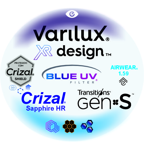Tratamentos: Crizal Sapphire HR (+ transparência); Blue UV (proteção contra raios de telas)