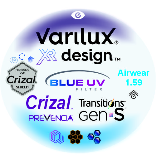 Tratamentos: Crizal Prevencia (+ proteção UV); Blue UV (proteção contra raios de telas)