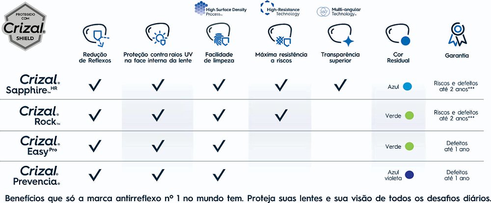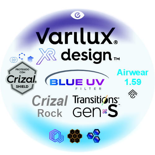 Tecnologias: Xtend, Nanoptix, XR motionTratamentos: Crizal Rock (+ resistência); Blue UV (proteção contra raios de telas)