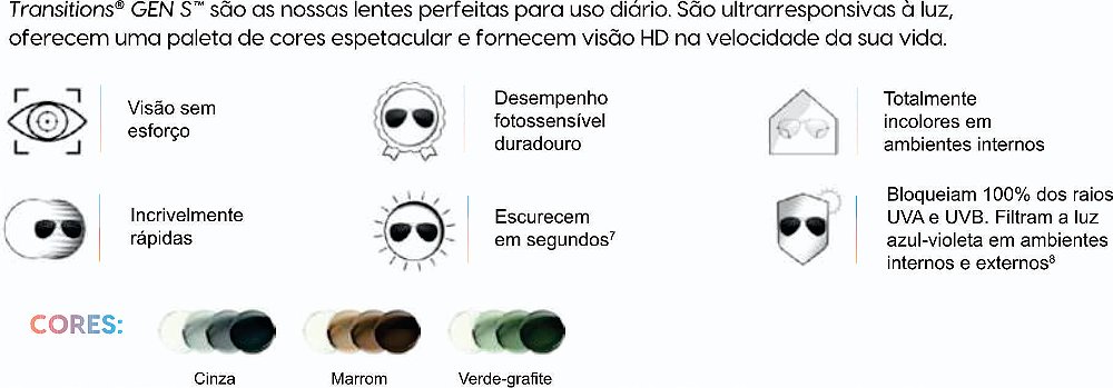 Tratamentos: Crizal Rock (+ resistência); Blue UV (proteção contra raios de telas)